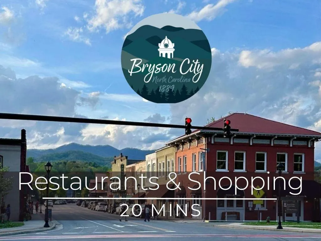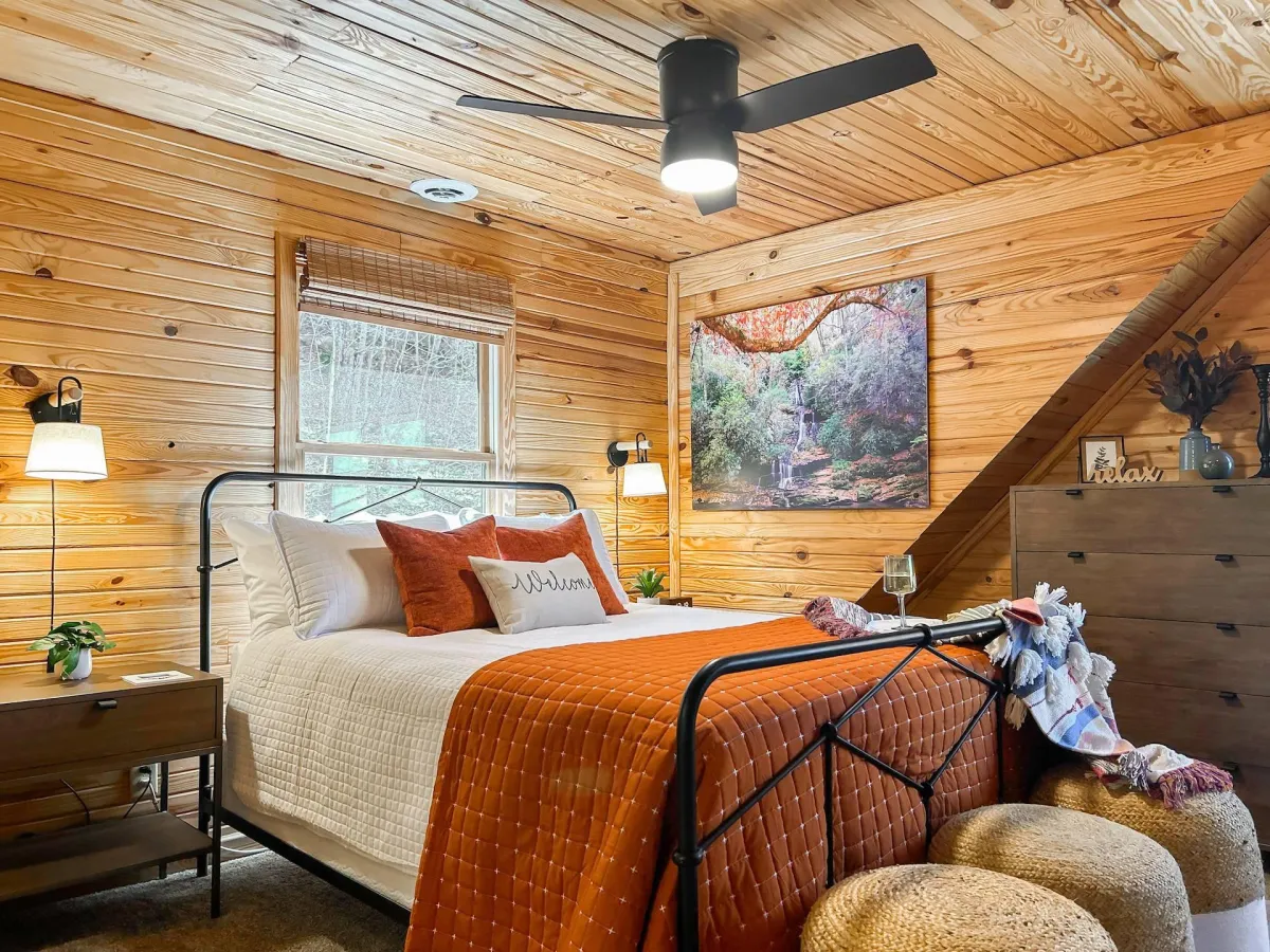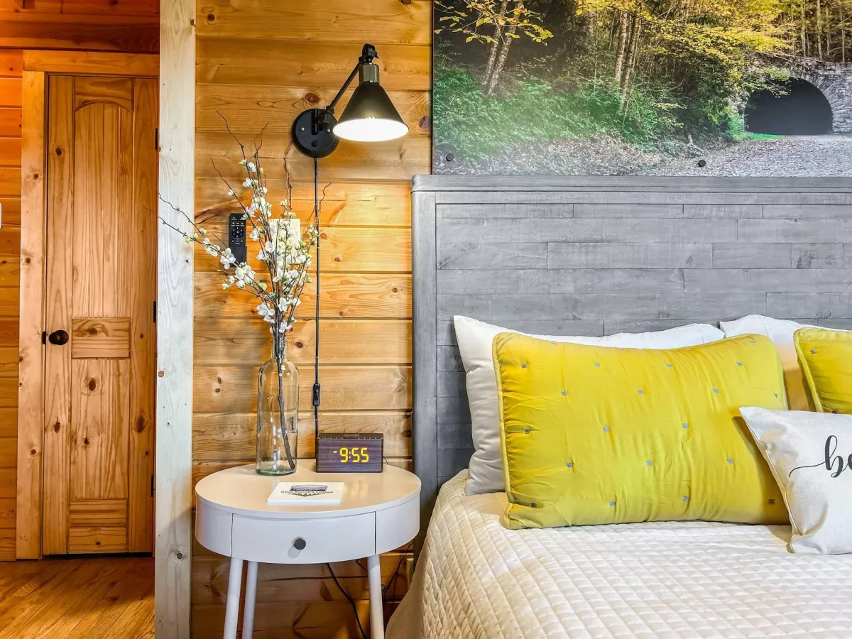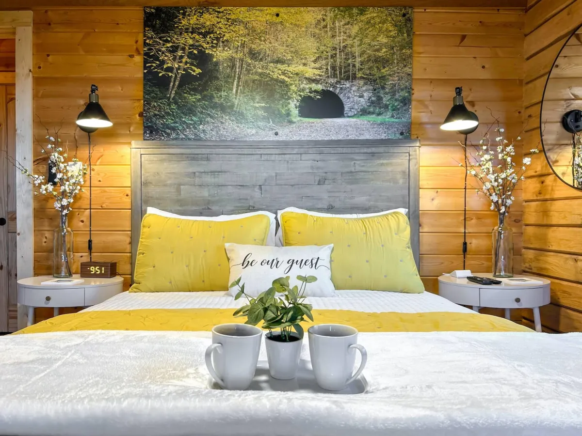 Bedroom 1 (1st floor - Queen bed) has beautiful full-length windows with direct views of the Smoky Mountains. The room is themed with two of the countless amazing, local hikes waiting to be experienced. (The Road to Nowhere Tunnel and Kephart Pong Trail)