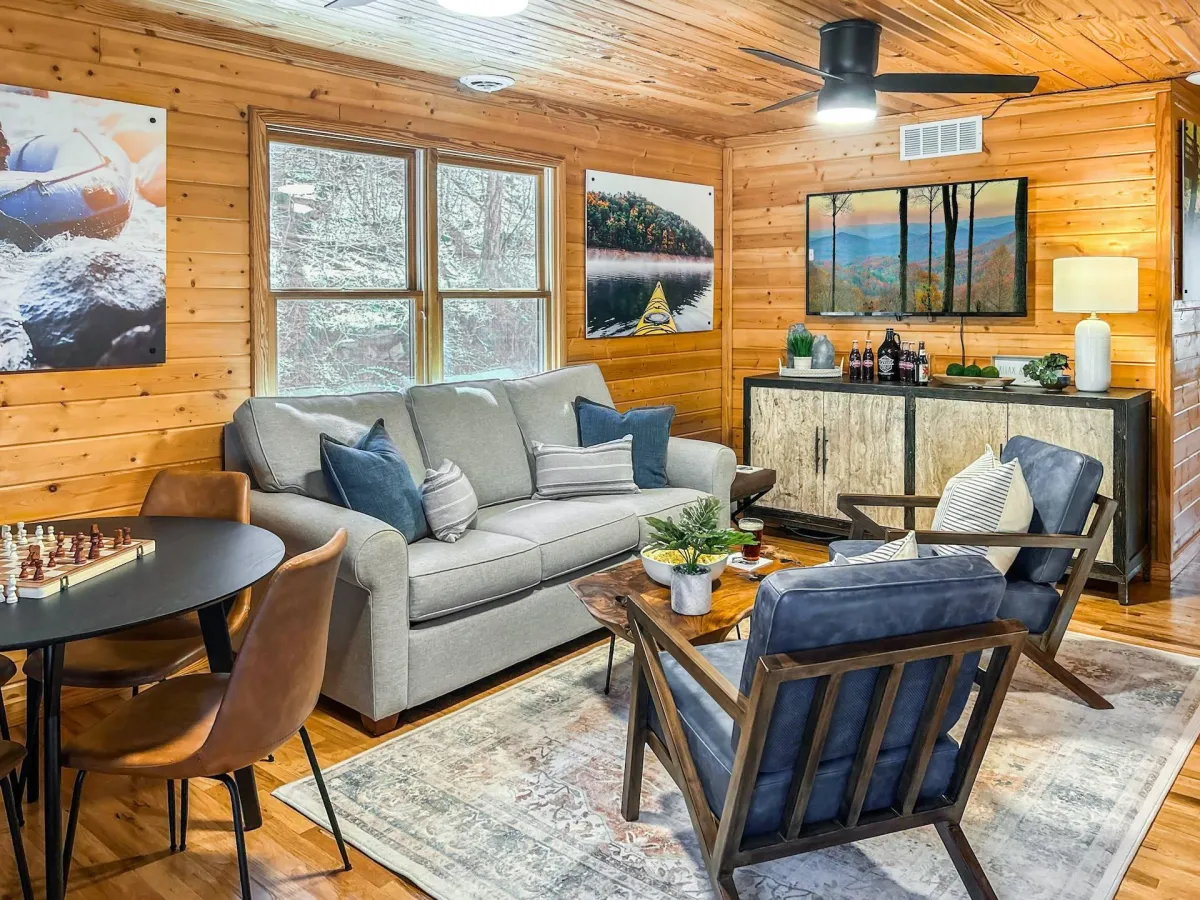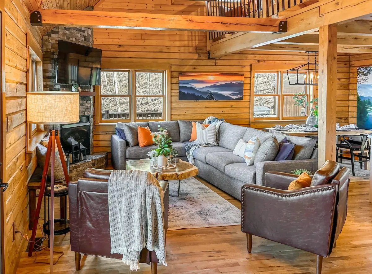 As you enter through the cabin you'll be greeted by a newly renovated kitchen and dining room complete with seating for 6 with additional seating just beyond the kitchen. The open floorplan highlights the breathtaking views of the mountains. A romantic gas fireplace provides cozy warmth on those colder days and nights. The cabin offers High-Speed Starlink internet, robust Wi-Fi, and 4 flat screen TVs with Amazon Prime and YouTube TV provided!